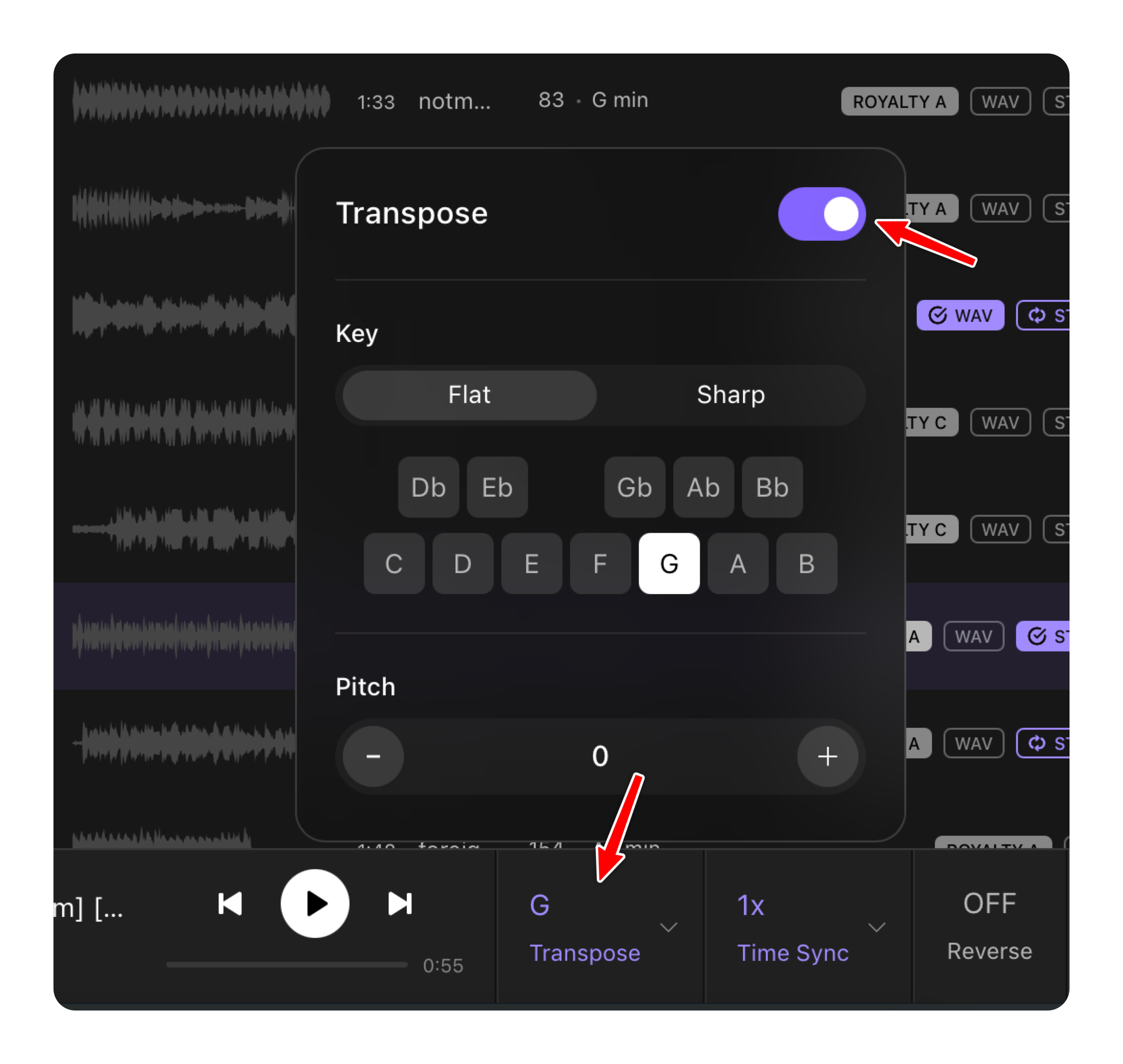 - Click the Transpose button at the bottom of the player.
