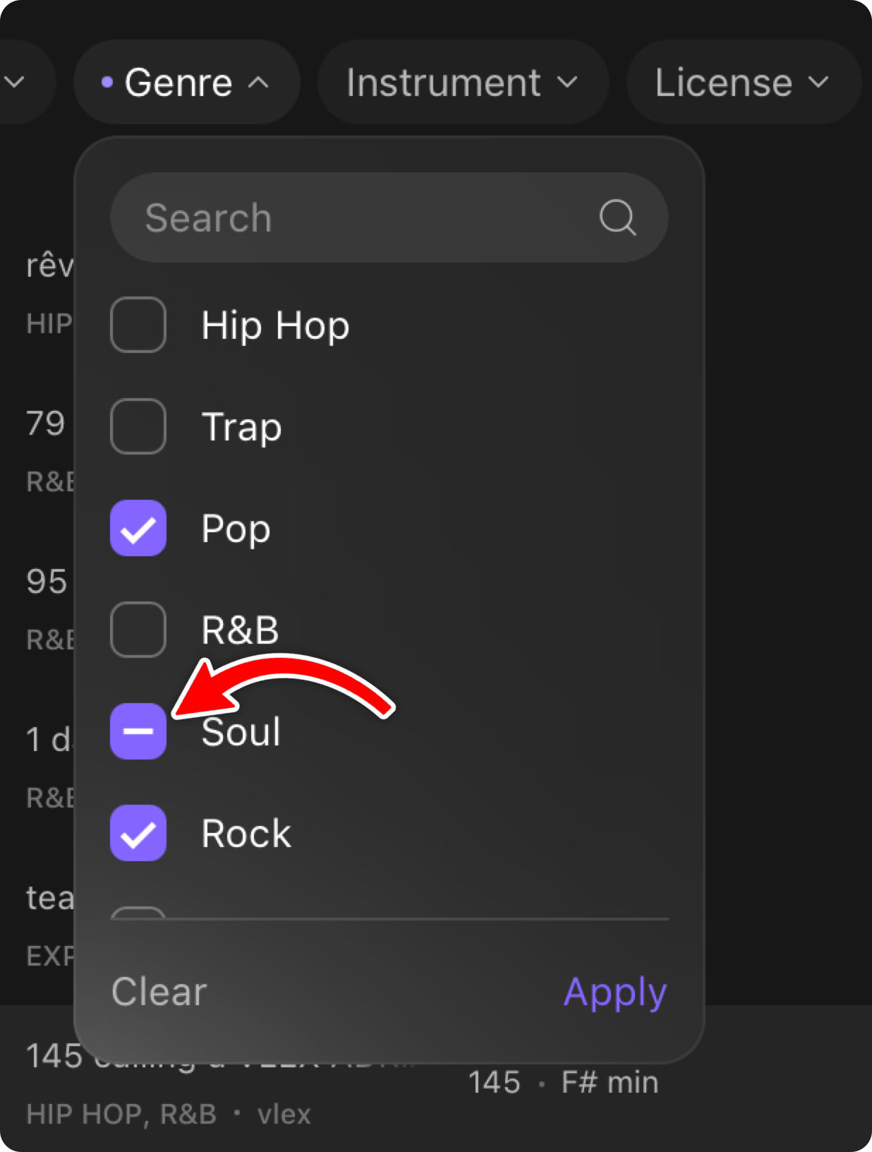 Tip: Click a genre, instrument or mood twice to exclude it from your search.