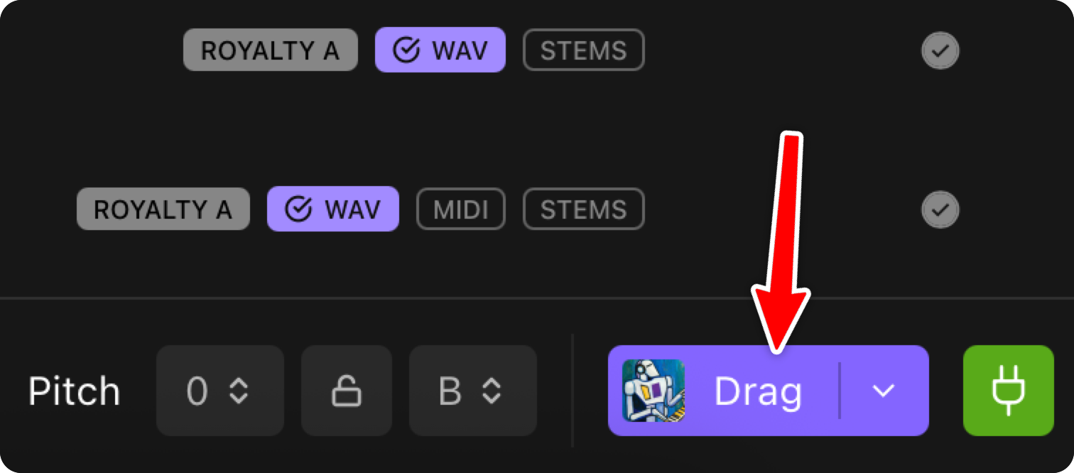 After downloading a sample, a purple Syncing button will appear on the bottom-right of the app. Once syncing is complete (this should take a less than 2 seconds), you'll see a Drag button. Use that to drag and drop the modified version of the sample to your DAW.