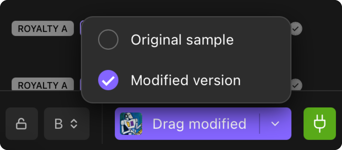 The drop-down arrow allows you to choose whether you want to use the Modified version (time-stretched / pitch-shifted) or the Original sample (non-modified version). The modified version is the default choice.